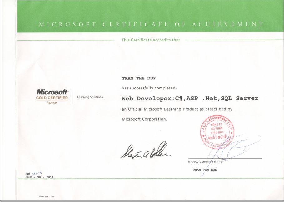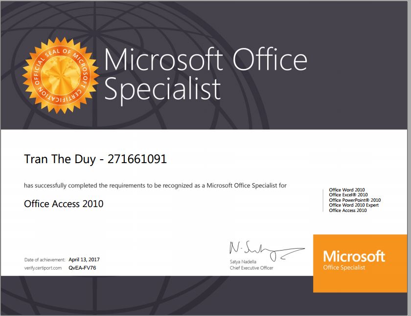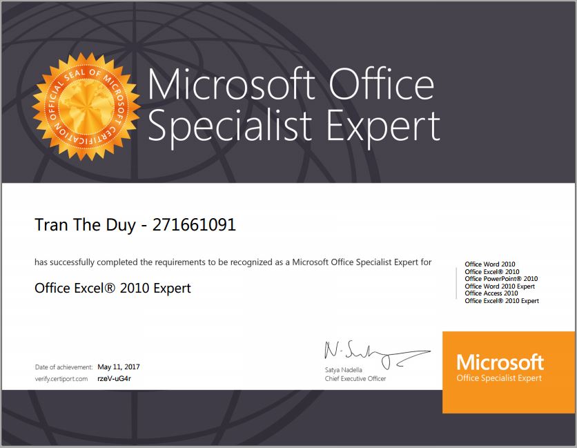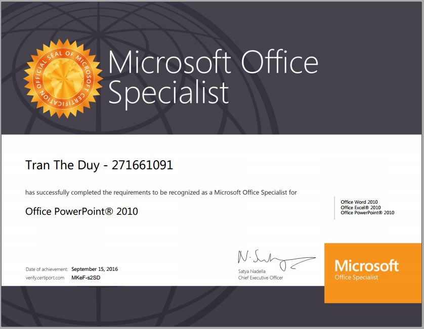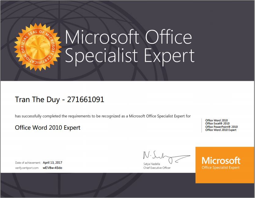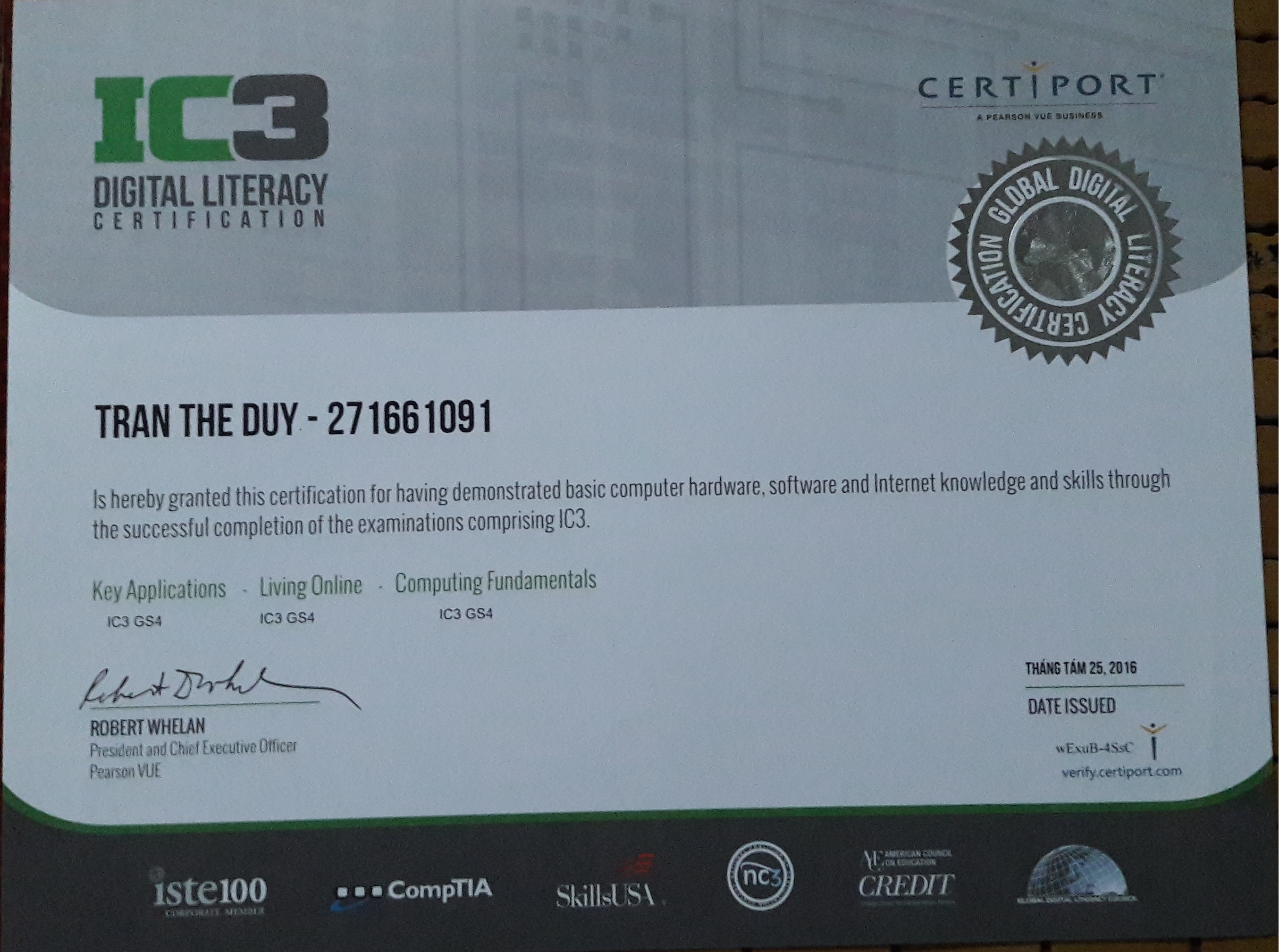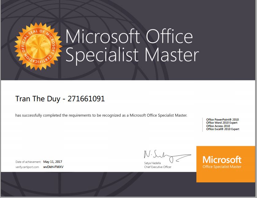 - Chứng chỉ quốc tế IC3-GS4, MOS Master(cao cấp toàn diện bên lĩnh vực tin học văn phòng)